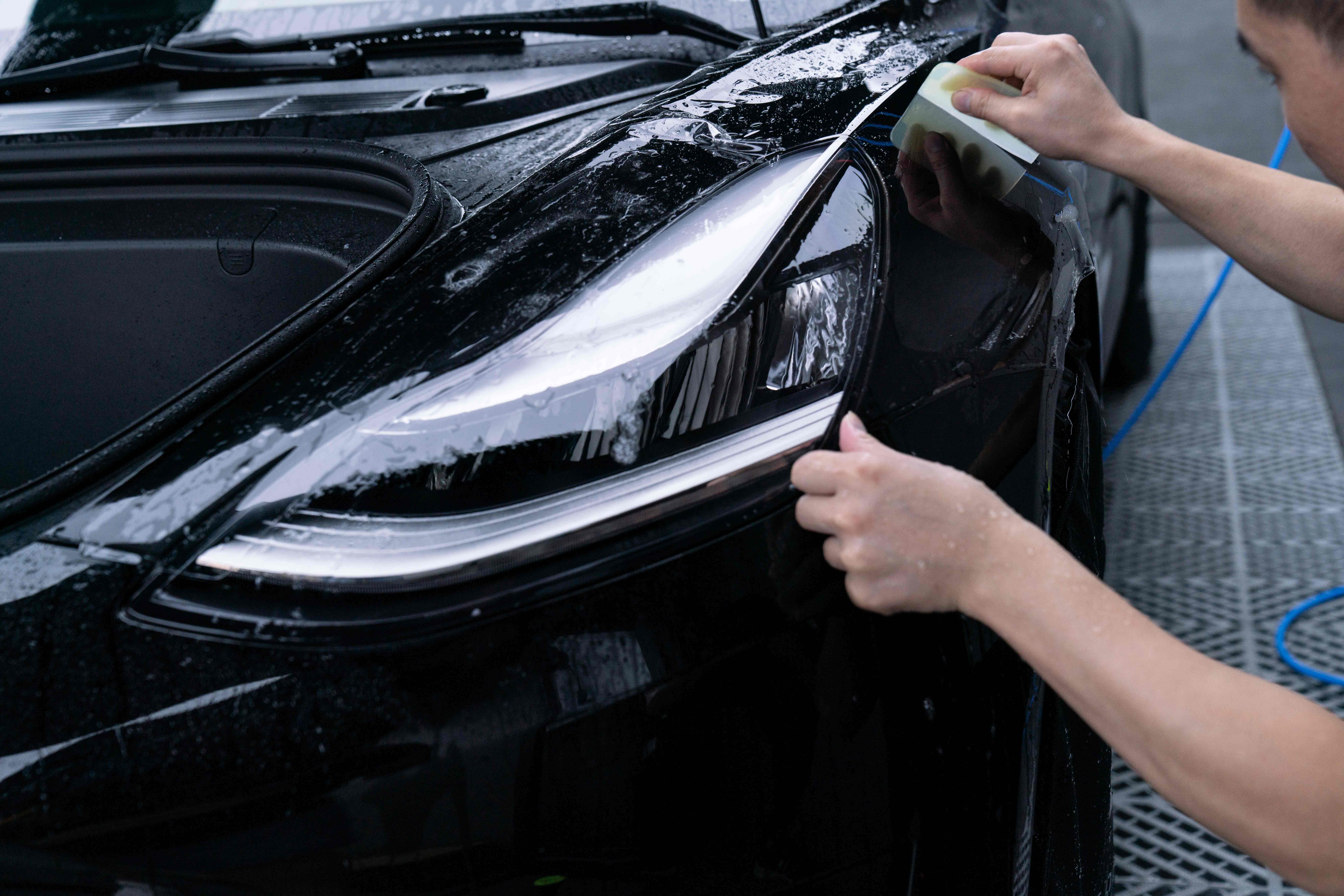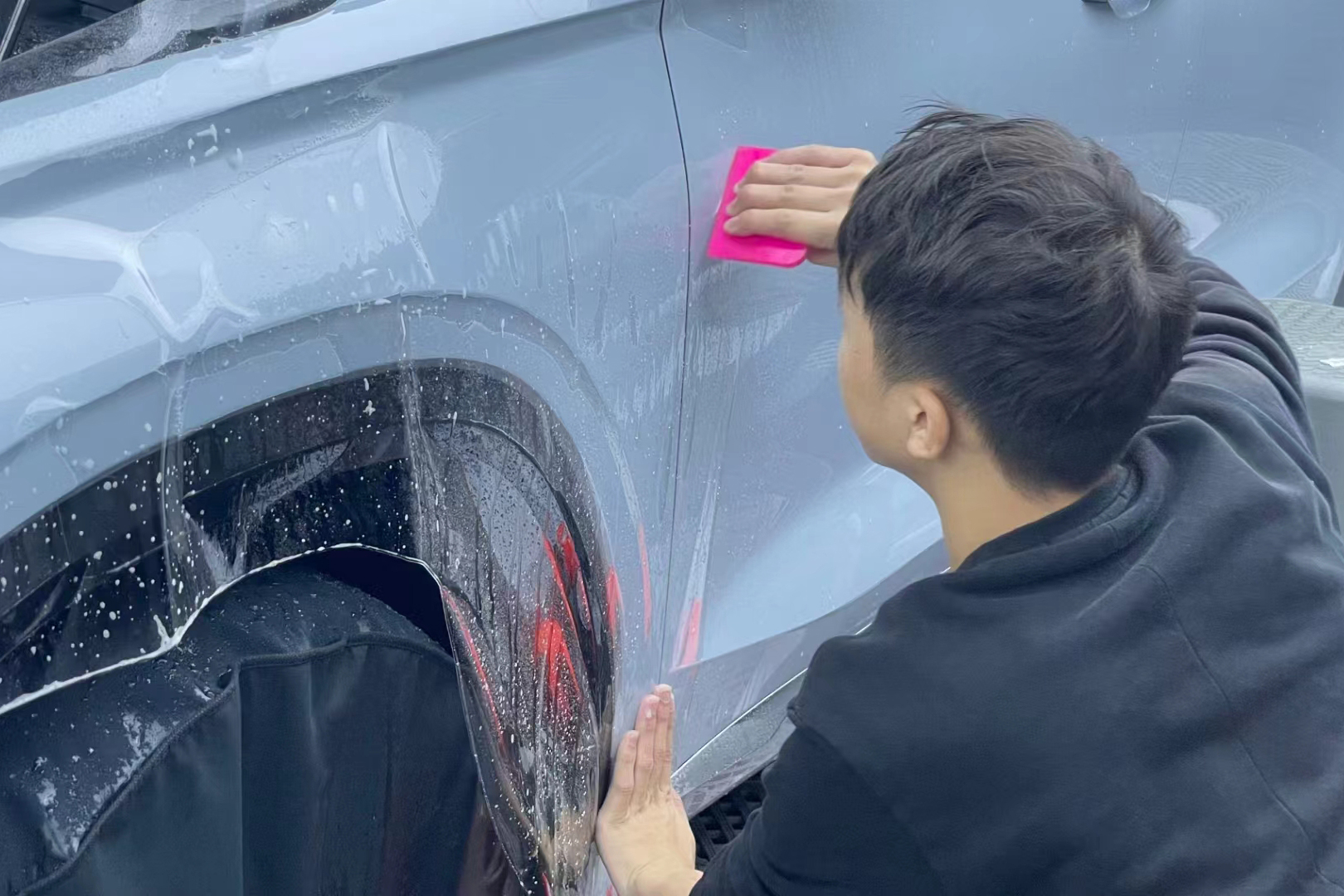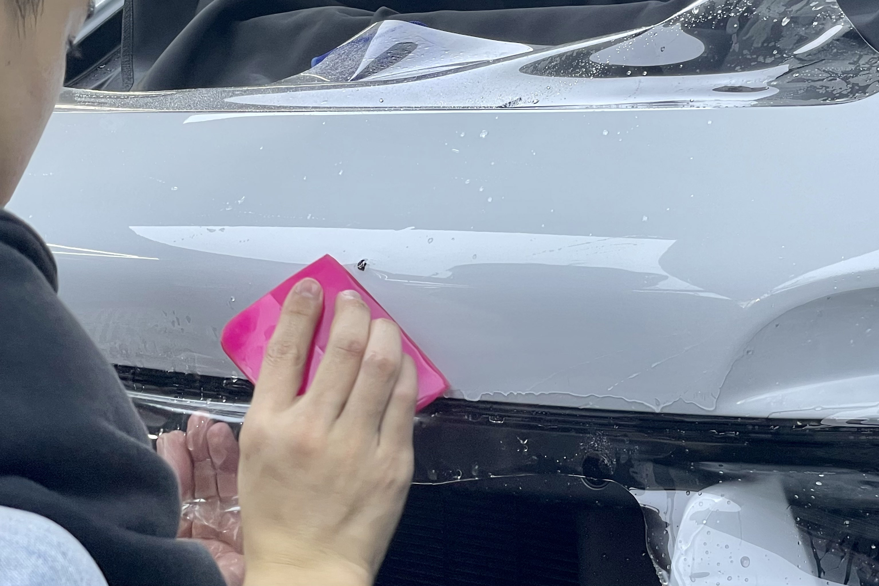 隐形车衣在施工之前,膜的胶层有覆膜纸保护,技师在将隐形车衣装贴在车辆表面的时候,需要将覆膜纸撕掉,然后,才可以通过胶层把膜粘贴在车漆表面,这是隐形车衣整体的施工过程。
